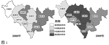 1、单选题 单位土地面积上投放的劳动力和资金多,产出多,则土地利用的集约度高,为集约利用;反之,土地利用集约度低,为粗放利用。图1是2000年和2009年吉林省土地集约利用程度区域差异图。读图回答(1)~(2)题。