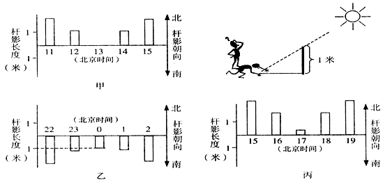 1、单选题 有三地同学设计一个“影子长度”的探究学习活动,他们在当地时间10:00—14:00每隔一小时测量一根1米长的杆的影子长度,所得数据制成图表。下图为6月22日三个地区同学所提供的观测成果。根据资料回答下列问题。