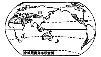 本题考查荒漠的形成。根据图示甲位于温带荒漠,处于大陆内部;乙为热带荒漠,主要原因是受副热带高压控制。均为原生性荒漠,难以治理。所以本题选择D选项。
