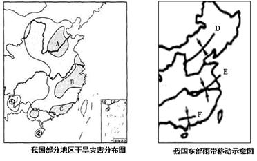 ,B地多发生在_____季,当B地发生干旱时,雨带位于右上图中___ 处(请填字母)。