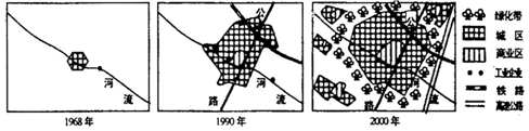 5、单选题 该图为某大城市1968年、1990年、2000年的同比例尺平面示意图,分析回答13-14题。