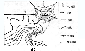 4、综合题 (16分)图8为“我国东南某沿海城市示意图”,读图回答下列问题。
