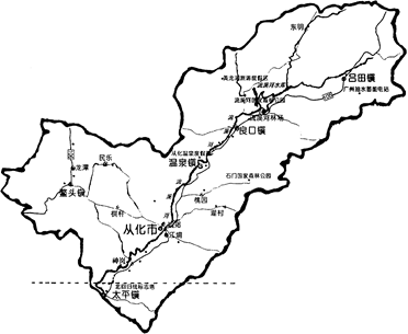 资料1:从化市是位于广州市北郊的山区县级市,市区距广州中心城区约60千米,辖区总面积2009平方千米。该市地处珠江三角洲平原向粤北山区的过渡地带。境内北部高山环抱,南部丘陵相连,山地丘陵约占总面积的60%。有“广州生命河”之称的流溪河自北向南穿越全境,在南部形成低平狭长的流溪河平原与珠江三角洲平原连为一体。从化市扼守珠江三角洲向粤北山区和湘、赣两省的陆路交通要塞,105、106国道贯穿东部和西部,京珠高