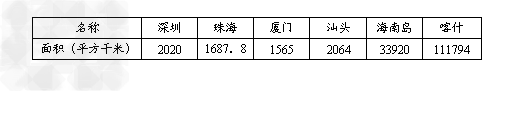 材料四:继深圳、珠海、汕头、厦门和海南之后,2010 年5 月,中央正式批准喀什设立经济特区,下面为我国六大经济特区面积比较表。