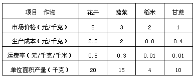 4、单选题 ? 下表为四种农作物产销资料,假如该地区是一个地势平坦的平原,可种植花卉、蔬菜、稻米和甘蔗等四种农作物,其产品全部提供某一市场消费,且地价相同,回答1—2题。