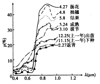 5、综合题 读冬小麦各生长阶段的反射波谱特征示意图,回答下列问题。