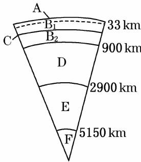 第(1)题,根据图中各字母所在的位置及深度可判断其名称,如A层为最外一层且厚度最薄,应为地壳;图中33千米处为莫霍界面,2900千米处为古登堡界面,据此可判断B1、B2、D三者均为地幔的组成部分,再根据900千米标注,判断B1、B2均为上地幔,D为下地幔。第(2)、(3)题,C为软流层,而岩石圈指地壳和软流层以上的上地幔顶部。解答该题的关键是明确地球内部圈层划分的两个不连续面的深度。