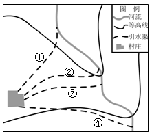 1.河流常发育在山谷中,山谷的等高线里面低,得到该处的河流大致由东南向西北流,①、②、③三条引水路线中河流取水点的海拔高度均低于村庄的海拔高度,河水不可能自流入村,④路线取水点的海拔高度明显大于村庄的海拔高度,河水最可能自流入村。