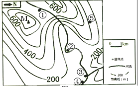 小题2:依据图示等高线判断,②地海拔100-200米,M地海拔在700-800米,交叉相减可得,两地相对高度变为500-700米,因此C符合;