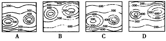 【小题1】由指向标可知东面的山地坡度和缓,等高线应稀疏,且最高处大致相当,西面的山地坡度大,等高线明显密集,故选D。