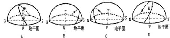 5、单选题 11月5日,北京(40°N、116°E)当地看到太阳升落的视运动轨迹示意图为(?)