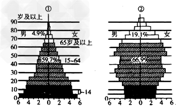 5、多选题 下图中的①②两图分别示意两个国家近年的人口构成,这两国家最有可能是