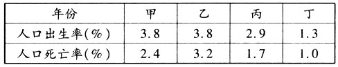 1、单选题 下表为某国历史上不同年份的人口出生率和死亡率表。甲、乙、丙、丁四个年份人口变动的情况反映了世界人口增长模式的一般规律。据此回答1~2题。