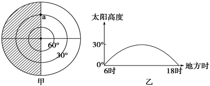 3、单选题 图甲为“某日某时刻等太阳高度分布示意图”,非阴影部分表示m日,阴影部分表示m+1日;图乙为“该日a地太阳高度变化示意图”,读图完成下列各题。