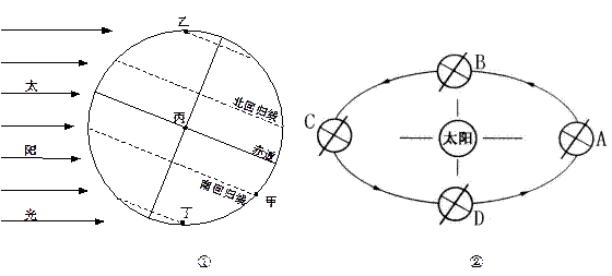 (3)图①中,甲、乙、丙、丁四地中,白昼最长的是?▲?,正午太阳高度最大的是?▲?。(2分)