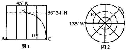 2、单选题 图1中AC为赤道,BC为晨昏线的一部分,此时D点的地方时为15点。读下图1、图2,然后回答14—15题。