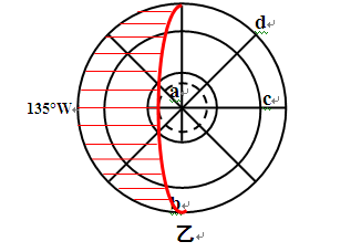 【小题1】图示北极圈及其以北地区出现极昼现象,135°W经线的地方时为0:00。据此经线转换。