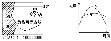 2、单选题 图中陆地地势较为平坦,右图中年径流量曲线是从左图中A、B两处测得的。回答下列各题: