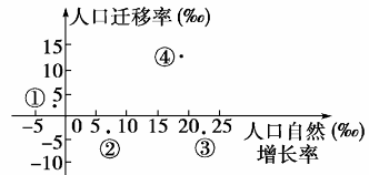 本题解析:图中纵坐标代表人口迁移率,正值为迁入,负值为迁出;横坐标为人口自然增长率,正、负值分别为正负增长。在图中的四点中,①地人口迁移表现为较低的迁入,自然增长率为负增长;②地人口迁移表现为较低的迁出,较低的自然增长率;③地人口迁移表现为较低的迁出,较高的自然增长率;④地表现为较高的迁入和较高的自然增长率。结合发达国家大城市中心区由于环境恶化,地价上涨等原因导致的人口向郊区和乡村迁移的现象,以及发达国家因经济发展和思想意识而导致的人口低增长,可以断定②地符合发达国家大城市的情况。