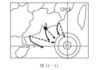 本题解析:台风属于低压中心、气旋,位于台风中心的不同部位,各地的风向是不同的。如图11-11所示,