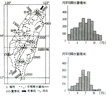 (2)比较台北和台中降水的季节变化异同点并说明主要原因。(6分)
