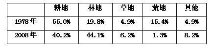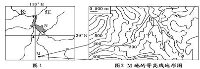 4、综合题 图1为某区域的水系分布图。某校研究性学习小组对图1中的M地进行实地考察,并查阅了相关资料,发现近三十年来M地生态环境明显改善。图2示意M地的等高线分布(单位:m),下表示意M地的土地利用结构变化。读图表回答问题。(12分)
