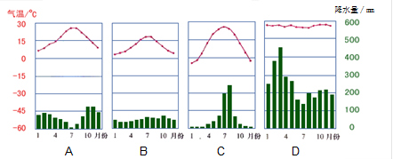 本题解析:分布在南北纬40°~60°大陆西岸的气候类型是温带海洋性气候,这个纬度终年受盛行西风的影响,风从海洋吹向陆地,来自海洋的暖湿气流是大陆的西海岸形成了终年温和多雨的温带海洋性气候。其气温和降水特征只有B选项符合。