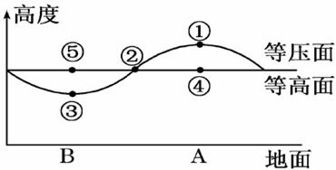 (2)根据气压变化的特征可知,海拔越高,气压越低,图中各点中⑤位于等压面以上,气压最小。