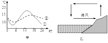 2、综合题 下图中,甲图表示的是某滨海地区陆地和海洋表面气温日变化的曲线图,乙图表示的是该地区海陆之间气流的变化图,回答