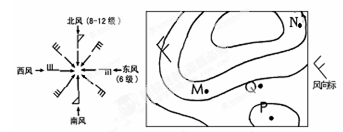 1、单选题 下图左是“风向标示意图”,右是“某地近地面水平气压分布示意图”,读图完成下列问题。