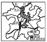 4、单选题 鄱阳湖上承赣、抚、信、饶、修五河之水,下接长江。丰水季节浪涌波腾,浩瀚万顷,水天相连;枯水季节水落滩出,枯水一线,野草丰茂,芦苇丛丛;湖畔峰岭绵延,沙山起伏,沃野千里,候鸟翩飞,牛羊倘佯。美丽富饶的鄱阳湖养育了世代生长居息湖畔的万物生灵。下图表示鄱阳湖生态经济区范围。读图,完成下列各题。