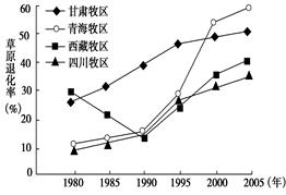 小题1:此题考查的是图表的判读。可以先排除错误选项。从四大牧区草原退化趋势图中可以看出青海牧区超载持续时间长,但年平均超载率却小于甘肃牧区,因此①选项不正确,四大牧区从表中只可以了解到超载率,而无从知道超载面积,所以④不对,由此可以排除有①、④的选项。四大牧区草原退化的现象均呈上升趋势,其中青海牧区草原退化速度最快。答案选B
