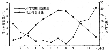 (1)图中折线显示灰霾天数冬季多,夏季少;对比图中气温变化分析,夏季近地面气温更高,导致气流对流旺盛,使近地面空气中污染物扩散;而冬季近地面气温较低,大气稳定,不利于空气中污染物稀释扩散,所以易形成雾霾天气。