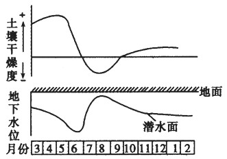 1、单选题 下图是我国某平原土壤干燥度及地下水位示意图(土壤含水分越少,土壤干燥度越大),完成1~2题。