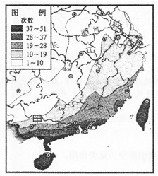 2、综合题 下图为我国东部影响严重的登陆台风次数(1949~2000年)分布图,读图回答下列问题