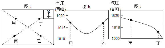 5、单选题 下图中图a为北半球某区域图,图b示意沿甲乙线的气压变化,图c示意沿丙丁线的气压变化。据此回答下列各题。