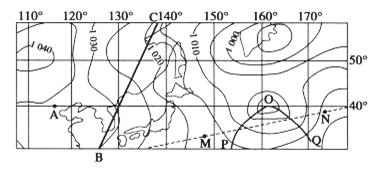 1、综合题 读“世界某地某日海平面等压线(单位:hPa)分布图”,图中虚线MN表示航海线,OP与OQ表示锋面,BC线为晨线,回答下列问题。(12分)