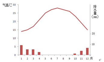 3、单选题 2013年12月13日埃及开罗(31°E,30°N)迎来112年来首次降雪。读开罗气候数据图(下图),回答下列各题。