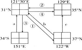 1.如果图中箭头①②③④表示我国的远洋航线,下列说法正确的是2.如果图中箭头a、b、c表示国际贸易中某农产品产销情况,该农产品是3.如果图中箭头b表示电子工业的转移方向,导致其转移的主要因素有?