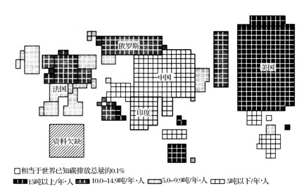 5、综合题 随着世界经济的发展,二氧化碳的排放量不断增加。目前,碳排放已成为全球普遍关注的问题。下图是21世纪初某年世界部分国家碳排放状况分布示意图。据图回答下题。