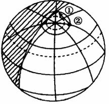 5、单选题 下图是一架飞机从②处起飞时的地球光照图(阴影部分为黑夜,非阴影部分为白天),已知①地所在经度为135°W。据此回答下列问题。