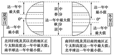 本题解析:同一条纬线上每天正午太阳高度相等 ;正午太阳高度就季节变化而言,赤道以北的纬度,每年12月22日前后达最小值;正午太阳高度就纬度分布而言,春秋二分由赤道向南北两侧降低;南北回归线上,太阳每年直射一次。