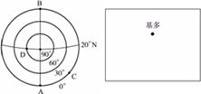 4、综合题 下面左图是“北京时间为某日10时的太阳高度分布示意图”,图中粗线为等太阳高度线,读后请完成下列问题。