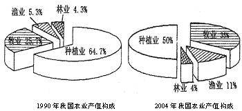 材料三:1990年和2004年我国农业产值构成图。