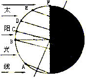 5、单选题 该图为地球日照图,F点位于北极圈,此时太阳高度最大的点为 ( )