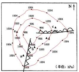 可知该天气系统为锋面气旋系统。通过比较可知a比b地气压高,若形成锋面则c附近为暖锋,ab附近为冷锋,d处等压线较e处稀疏,所以风力较小,通过判断可知e的风向为偏北风. ab附近为冷锋,由于暖锋降水在锋前,冷锋降水主要在锋后,所以ac可能出现降水天气