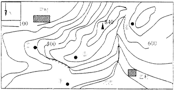 【小题2】④点可以看见乙村,但是和甲村之间有山峰阻挡,不能看见甲村;③地和甲村之间有山脊阻挡,所以②地看不见甲村;②地地势较高,可以看见甲村和乙村;①地由于受山脊阻挡,看不见乙村。