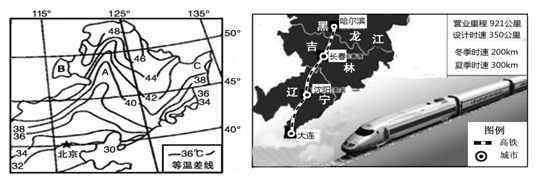 材料一 下面左图为中国东北部地区气温年较差分布图,右图为高速铁路分布图。