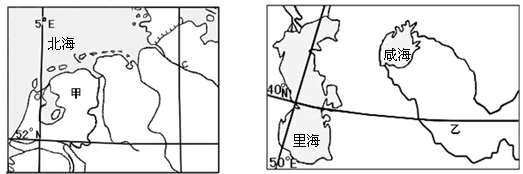 本题区域发展的条件。甲地为温带海洋性气候区,农业发展的主要限制因素为热量不足;乙为中亚地区,农业发展限制因素是水源不足;甲地区适合多汁牧草的生长,周围经济发展,适合发展乳畜业;乙地区农业生产不合理灌溉易引发土地盐碱化及湖泊面积萎缩。所以本题选择D选项。