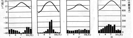 本题解析:本题考查气候类型的判断。根据四幅气候资料判断:地中海气候(雨热不同期);温带季风气候(最低月温在0°C以下,降水集中于夏季);温带海洋性气候(最低月温在0°C以上,降水终年分布均匀);亚热带季风气候(最低月温在0°C以上,降水集中于夏季)。